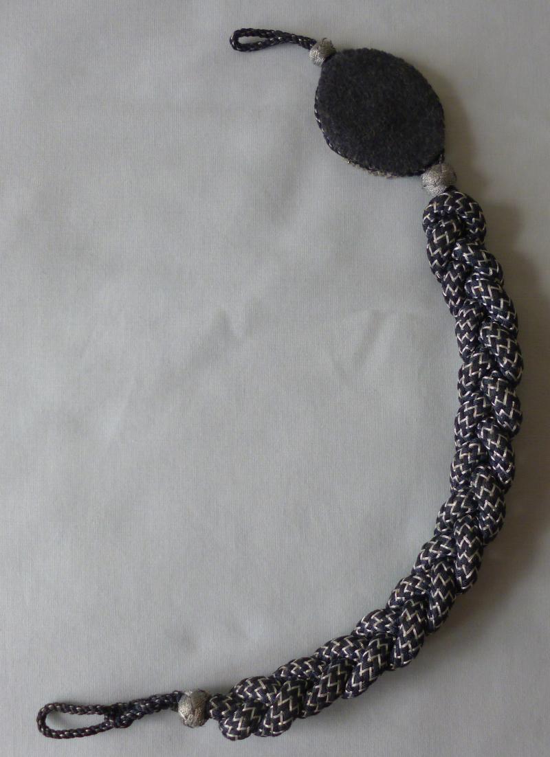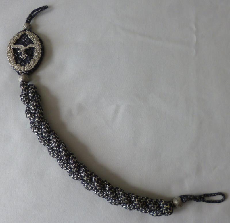 Blue-grey plaited cord lanyard interwoven with aluminium wire with a an alloy badge consisting of a Luftwaffe eagle within an oakleaf wreath.