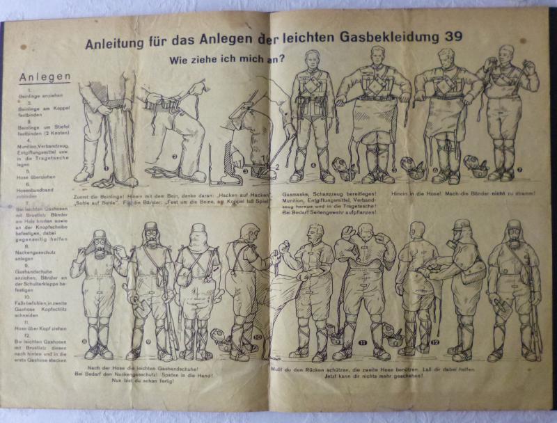 Very scarce four-sided A4 leaflet entitled "Anleitung für das Anlegen der leichten Gasbekleidung 39" (Instructions for donning the light gas-suit 39). The paper is a bit grubby and has certainly been used with a few minor edge nicks but is complete and overall in good condition.