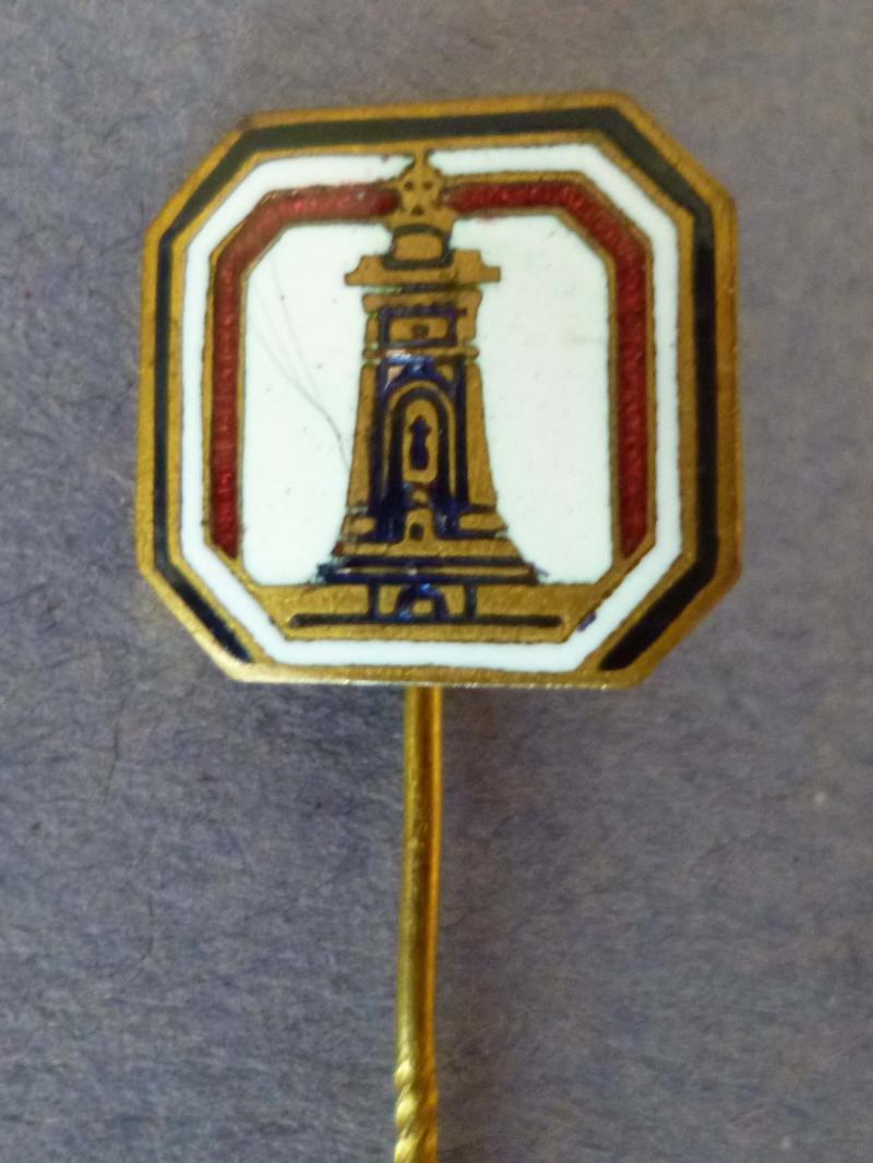 White enameled rectangular gilt-metal badge with black / white / red border surrounding the Kyffhäuser monument. The reverse is marked 'Ges.Gesch.'and has a knurled stick-pin fixing. There is a very fine hairline crack in the white enamel field but otherwise very good condition.