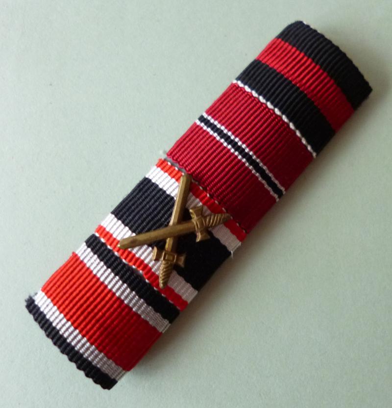 Very nice neat four ribbon bar consisting of 1939 Iron Cross 2nd Class / War Merit Cross 2nd Class with Swords / Ostfronf Medal / Sudetenland Medal. The bar is backed with field-grey cloth with working pin & hook. Excellent condition.