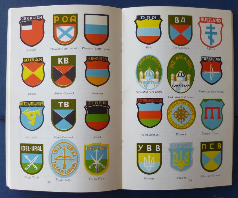 Excellent A5-sized card-back booklet published in 1968 and well ahead of its time in terms of information contained in it. There are 64 sides of text, photos and illustrations (most in colour) of foreign volunteer armshields, cuff-titles, awards, insignia, etc. A valuable little handbook for the collector in excellent condition with only minor age staining to the cover.