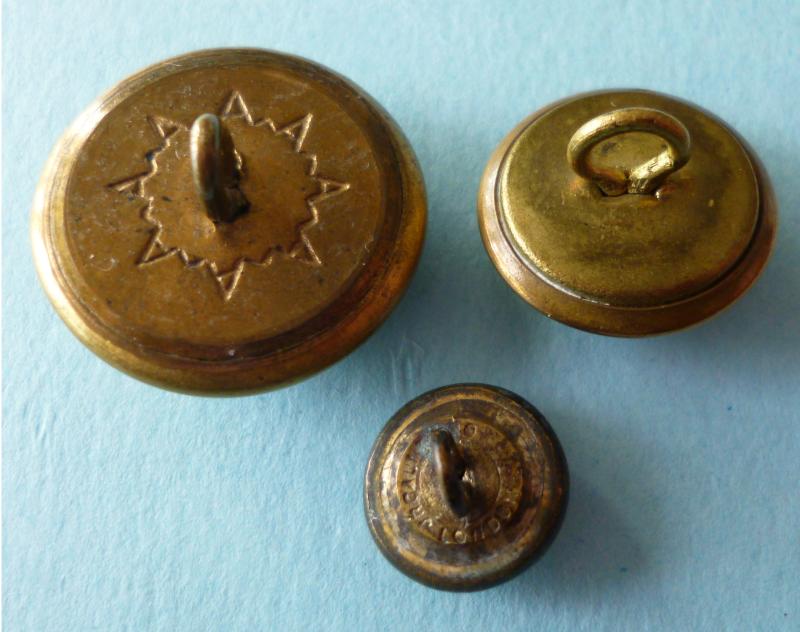 Three different-sized brass regimental buttons complete with shanks and in nice condition. No maker marks. Buttons are 25.5mm, 19.5mm and 13mm diameter.