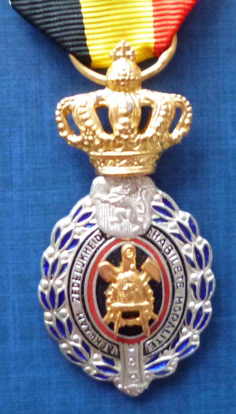 Gilt and silvered metal with enameled obverse complete with original ribbon bearing the ribbon rosette. Excellent condition..