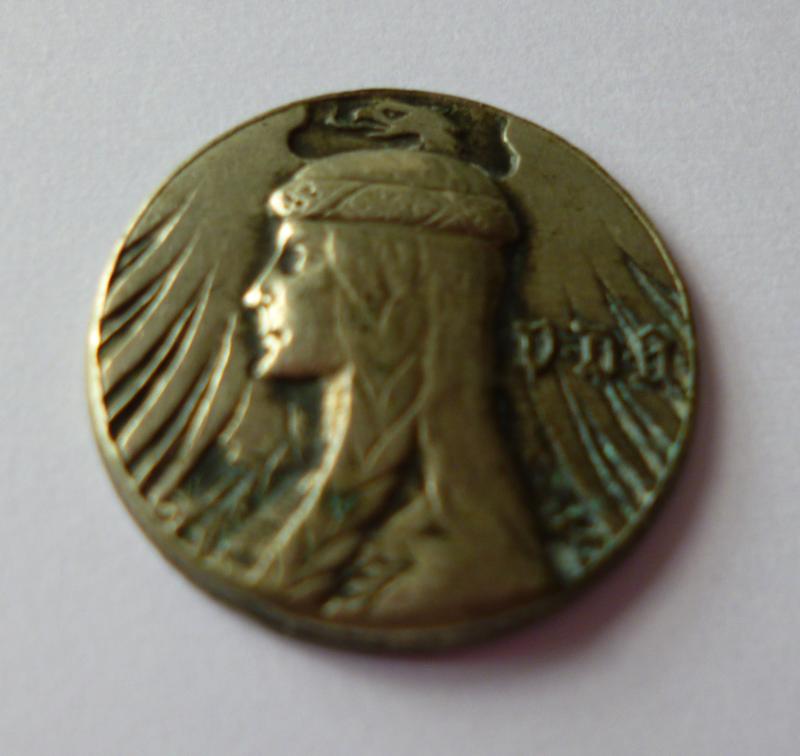 Silver circular badge 18.5mm dia. with stick-pin fixing on the reverse. No makers mark. Very nice condition with some traces of verdigris in some recesses.