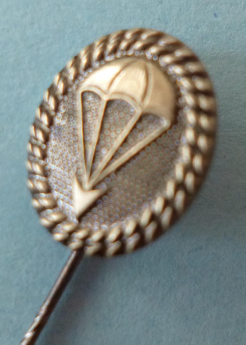 Silver metal oval, with a roped border surrounding a parachute as worn by parachutists /air-landing troops in the period 1955-7 in civilian dress. This was before the formation of the 1st Luftlande Division. The reverse has a knurled stick-pin fixing. No makers mark. Virtually mint condition.