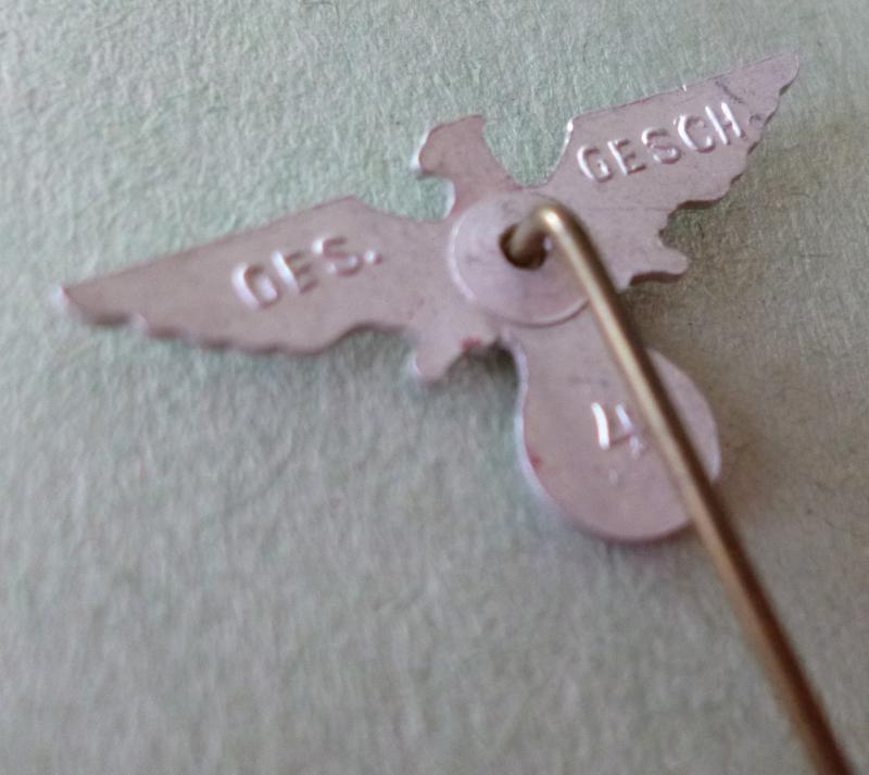 A miniature version of the veteran's organisation breast-eagle in aluminium with a long knurled stick-pin fixing on the reverse. The reverse is stamped with 'Ges.Gesch.' plus the manufacturer code '4'.for Steinhauer & Lück of Lüdenscheid. Near mint condition..