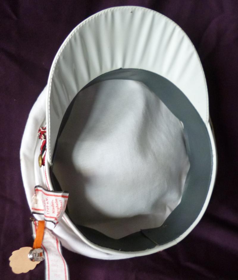 White linen cap with white plastic-covered visor. The cap-band is a very nice silk ribbon in the old Imperial black / white / red colours and the chinstrap consists of twisted/woven cords in the Imperial colours secured by two gilt pebbled buttons. The front of the cap has a shooting association gilt & enamel badge pinned in place. The inside is unlined but has a grey leather sweatband. Pinned on the side of the cap, are two identical printed silk ribbons bearing "St. Johannes-Schützen-bruder-schaft 1749 e.V Nieder-Burgheim (Möhne) 1971". There is also a tag bearing 'M.Filter, Festbedarf Paderborn'.