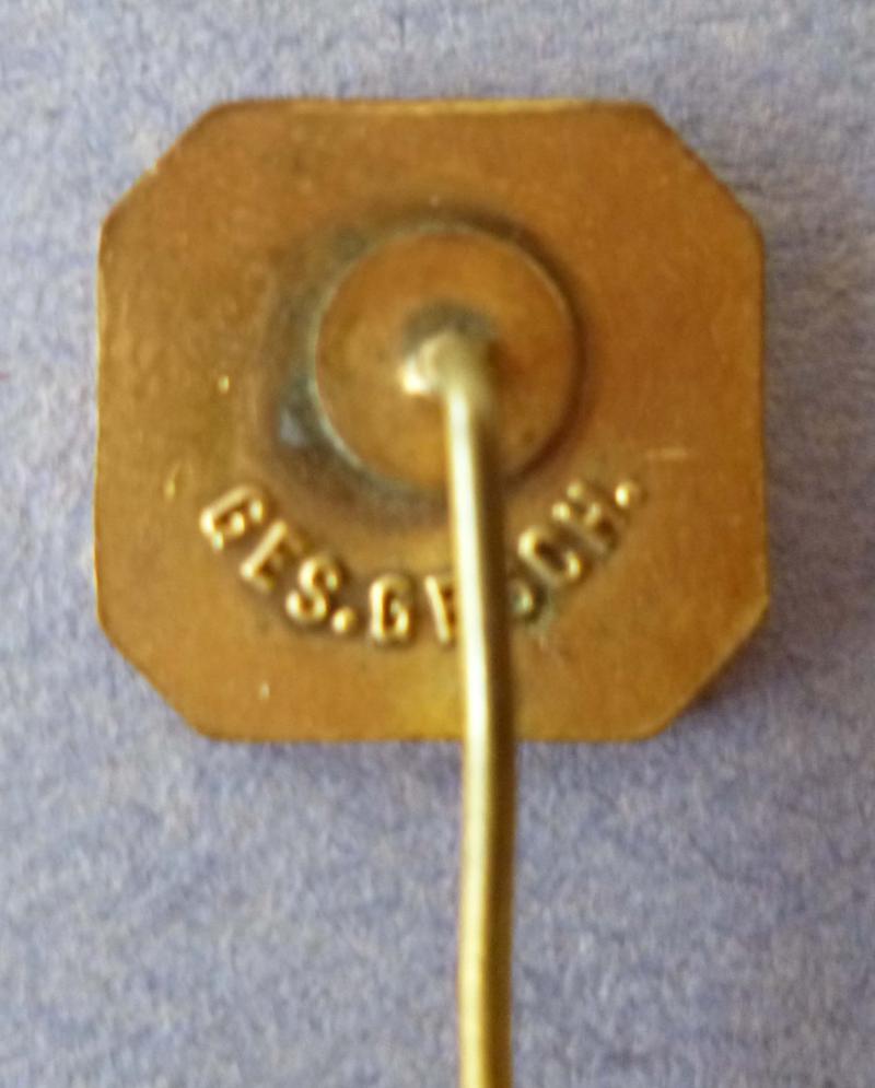 White enameled rectangular gilt-metal badge with black / white / red border surrounding the Kyffhäuser monument. The reverse is marked 'Ges.Gesch.'and has a knurled stick-pin fixing. There is a very fine hairline crack in the white enamel field but otherwise very good condition.