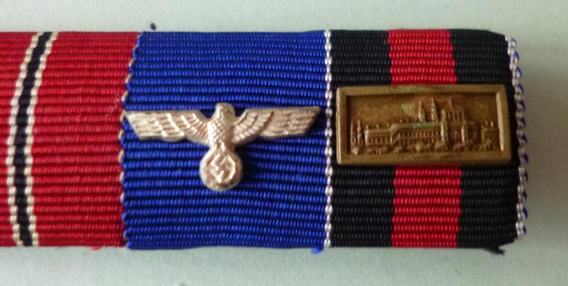 Beautiful condition five ribbon bar consisting of :1939 Iron Cross 2nd Class / War Merit Cross 2nd Class with Swords / Ostfront Medal / 4-year Service Medal / Sudetenland Medal With Prague bar. The ribbons have their appropriate emblems and the bar is backed with dark green wool with working pin & hook.