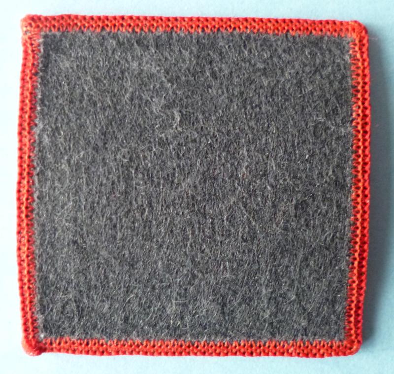 Machine-woven in black on red with red merrowed edge. Excellent condition.