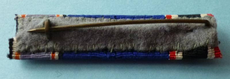 A narrower than the norm four ribbon bar consisting of 1939 War Merit Cross 2nd Class with Swords / Wehrmacht 4 & 12 year Service Medals / Luftschutz Medal. The bar is backed with grey felt and has its working pin & hook. For some reason this is the only narrow pattern bar of this type I have had in my seventy year-old collection !