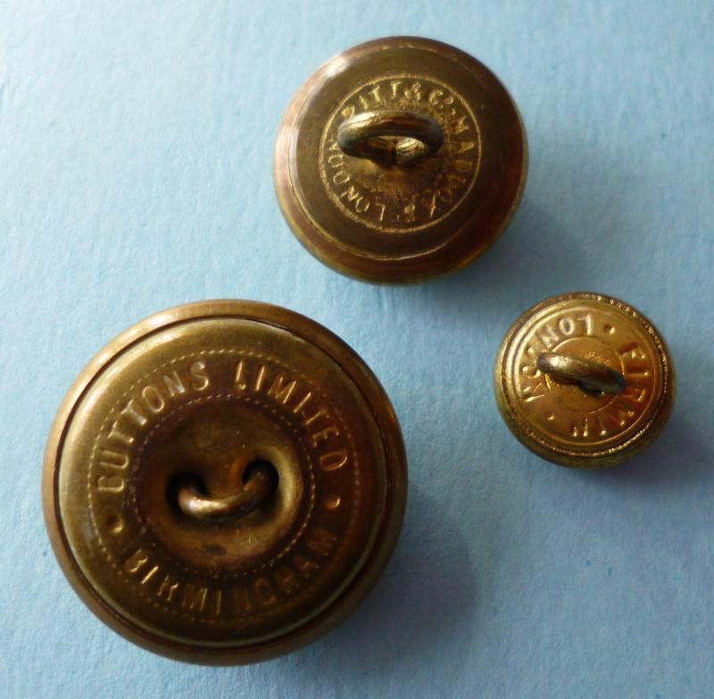 Three different-sized brass regimental buttons complete with shanks and in nice condition. Each button is stamped from a different maker.