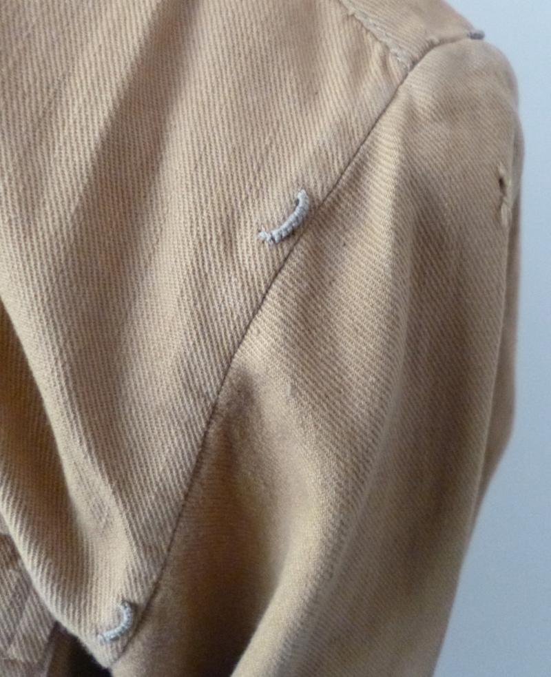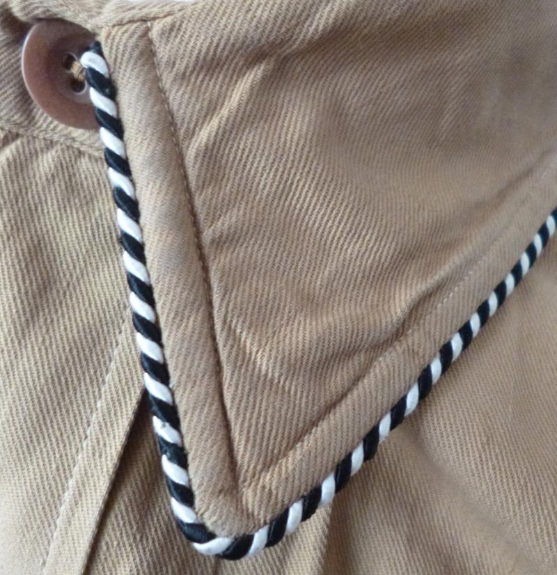 Standard original SA brown blouse/shirt with all original buttons, pebbled brass belt-hooks, black & white single-twist collar piping and loops on the shoulders for bandsman 'swallows nests' The shirt is devoid of any insignia and shows only to have ever had an epaulette on the right shoulder. The shirt has turn-back cuffs for cuff-link fastening. The removable front main buttons and pocket-flap buttons are copper-gilt and have various 'Qualität' markings on the reverse. The inside rear shoulders and waist-band are lined with white cloth. There are no labels or stamps in the shirt. It has one very minor hardly noticeable click in the.cloth and is very slightly grubby aftyer years of storage.. I acquired this shirt together with the SA corded breeches (Item 54352) in March 1979 and they have been on a coat-hanger, untouched since then.