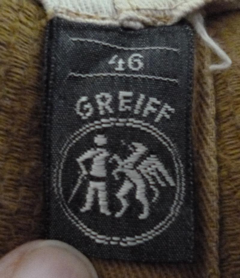 Very nice quality brown cord SA breeches complete with all brown plastic buttons and calf lacing. The breeches have no stamps but has a silk "46 Greif" label. The breeches are in excellent condition and came with the SA Bandsman's brown-shirt (Item 54348).